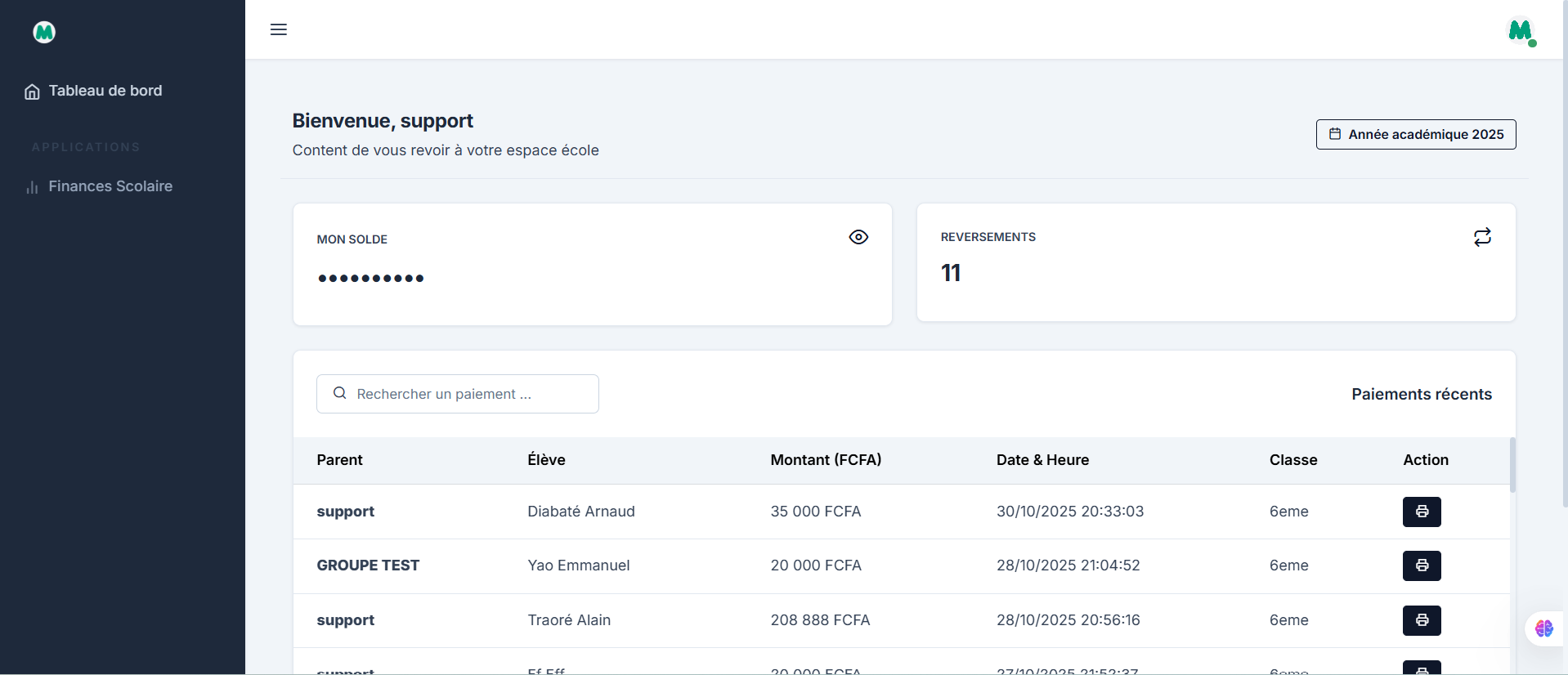 Le dashboard démo de MOYO offre une vue claire et instantanée des paiements et des activités scolaires. J’ai développé cette application web et mobile pour permettre aux écoles de gérer facilement leurs opérations avec une interface moderne, intuitive et parfaitement adaptée à leur quotidien.